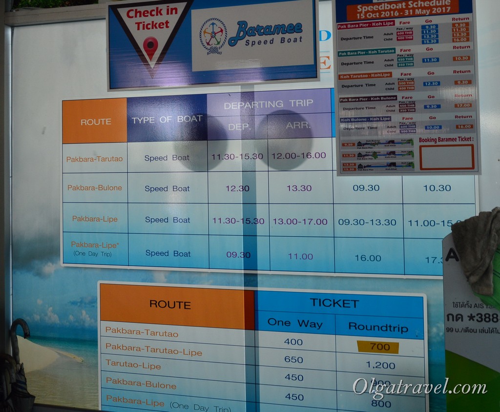 • Пакбара – Ко Тарутао – Ко Липе – 650 бат, т.е. вы можете выйти на Ко Тарутао, пожить там пару дней и по этому же билету плыть дальше 🙂