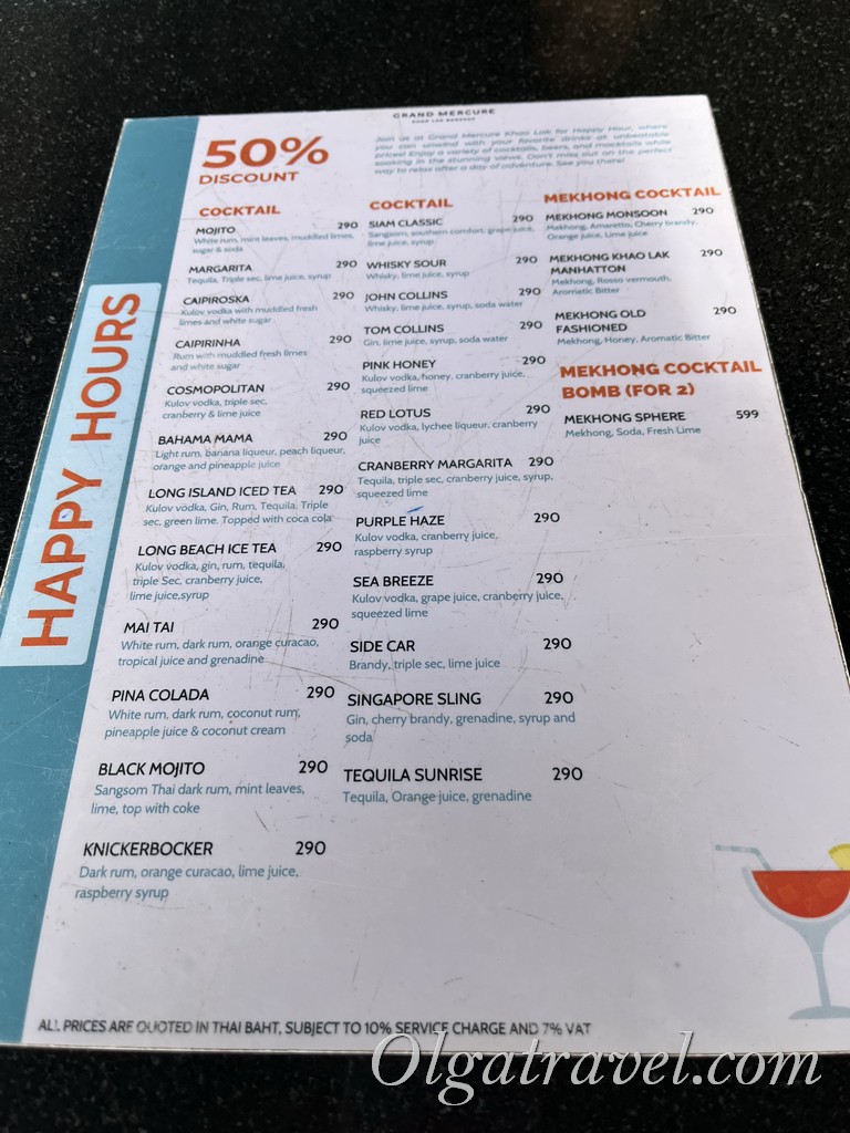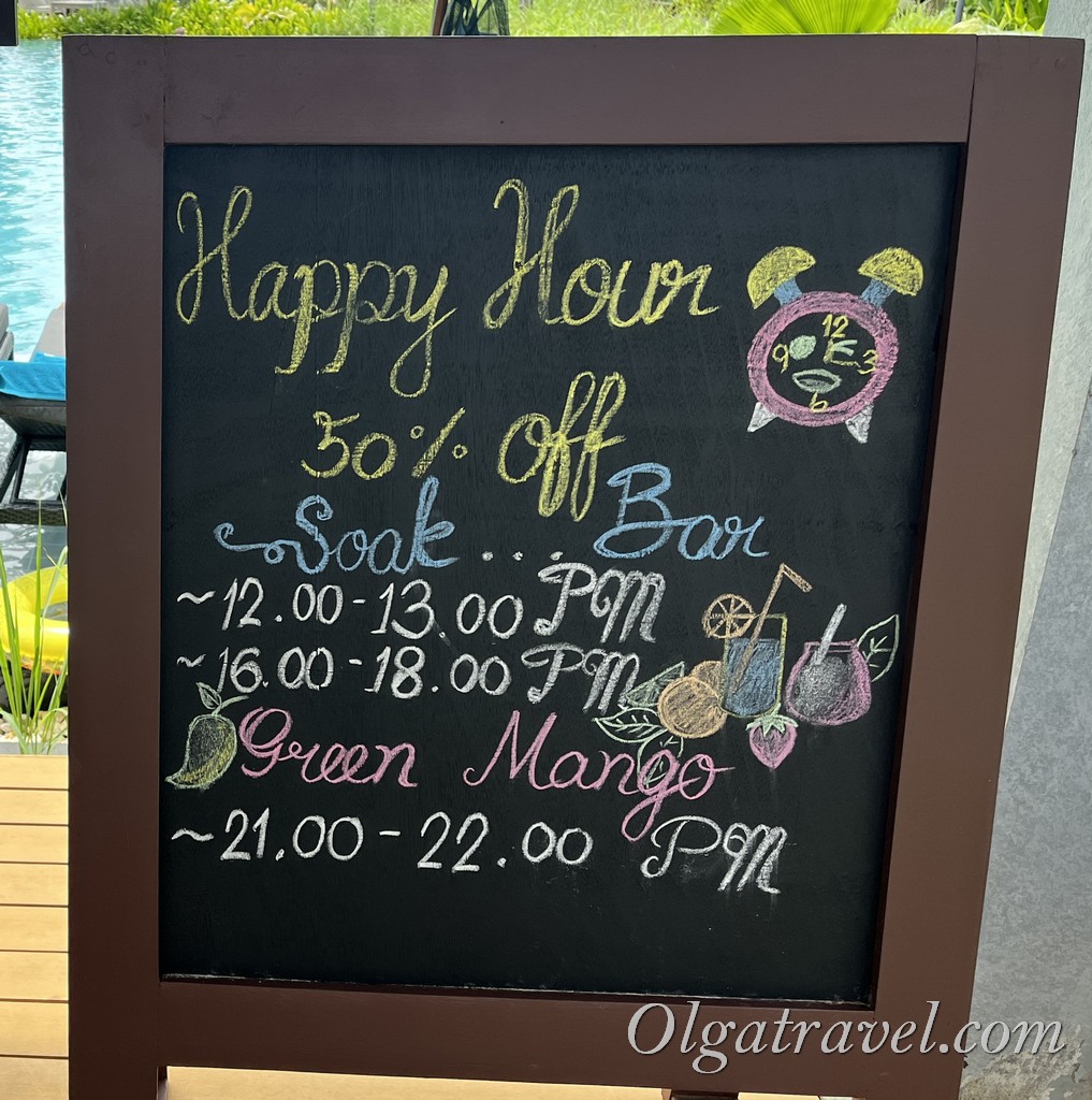 В баре возле бассейна Happy hours на коктейли (скидка 50% ) c 12:00 до 13:00 и с 16:00 до 18:00 – коктейли хорошие, получаются по 170 бат. Так же есть предложение — коктейль дня по 199 бат + налоги.