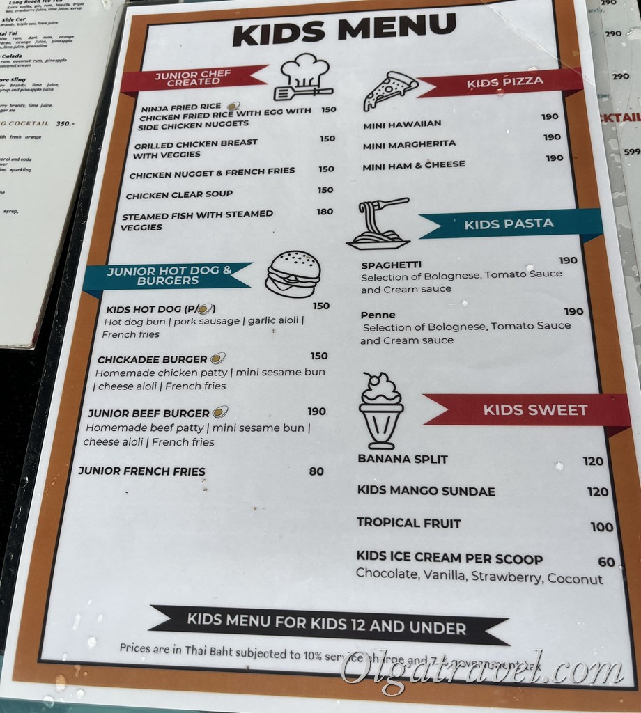 В ресторане отеля мы заказывали только из детского меню, все вкусно, цены нормальные. В отеле картошка фри 80 бат, в тайском кафе на пляже – 150 бат 🙂